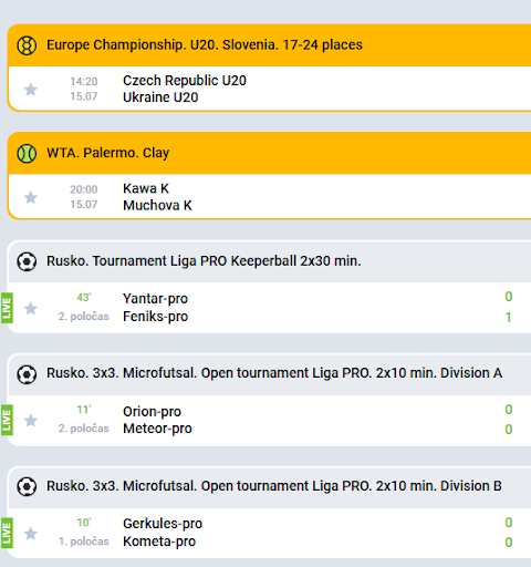 Live sázky mají na webových stránkách sázkové kanceláře obvykle vlastní sekci a u Mostbetu tomu není jinak. V nabídce najdete zápasy, které právě probíhají, a údaj o tom, v jaké sekci/minutě se nacházejí. Pak už stačí jen sledovat průběh zápasu a vývoj kurzů a vsadit si v ideální čas.